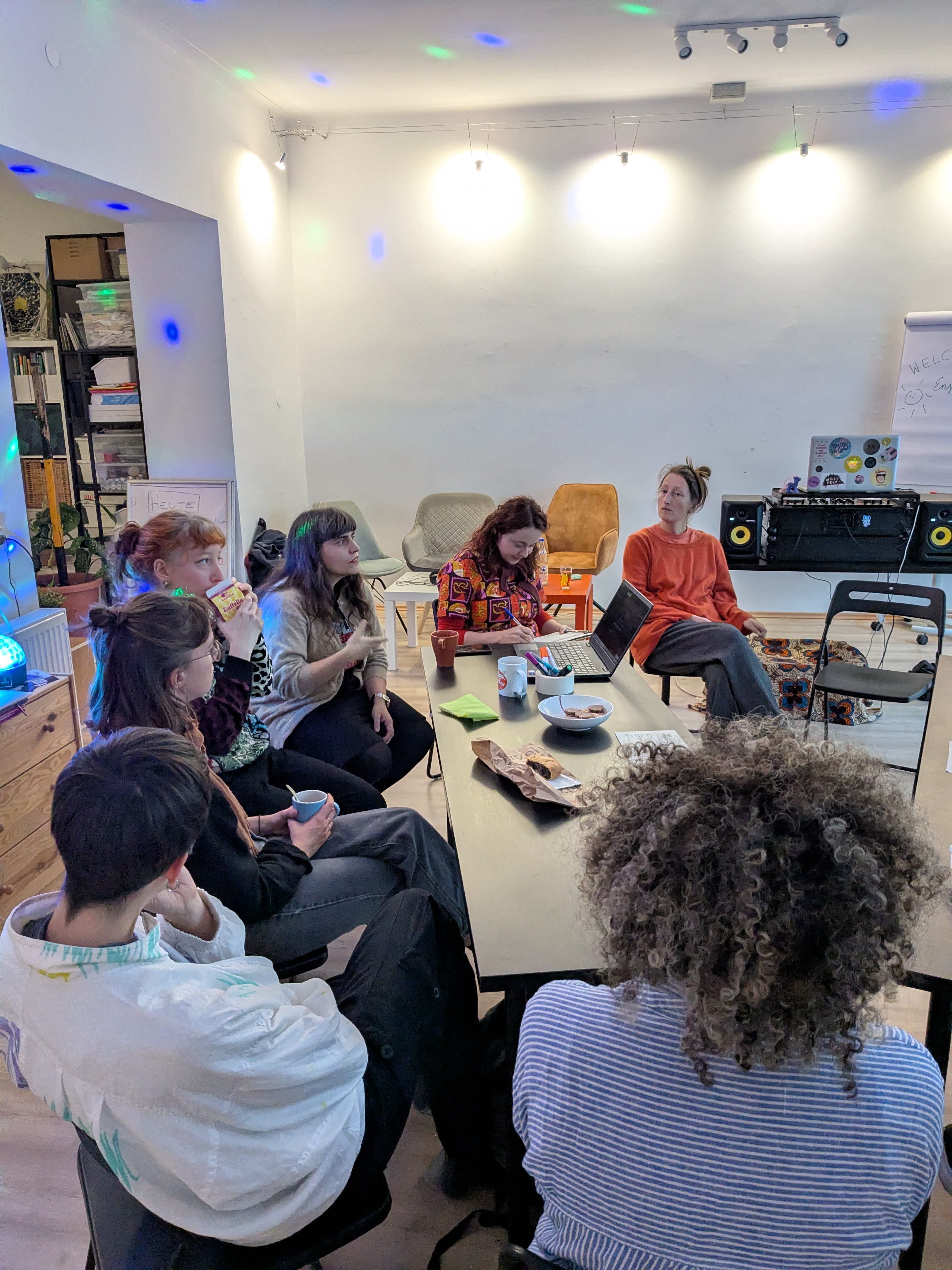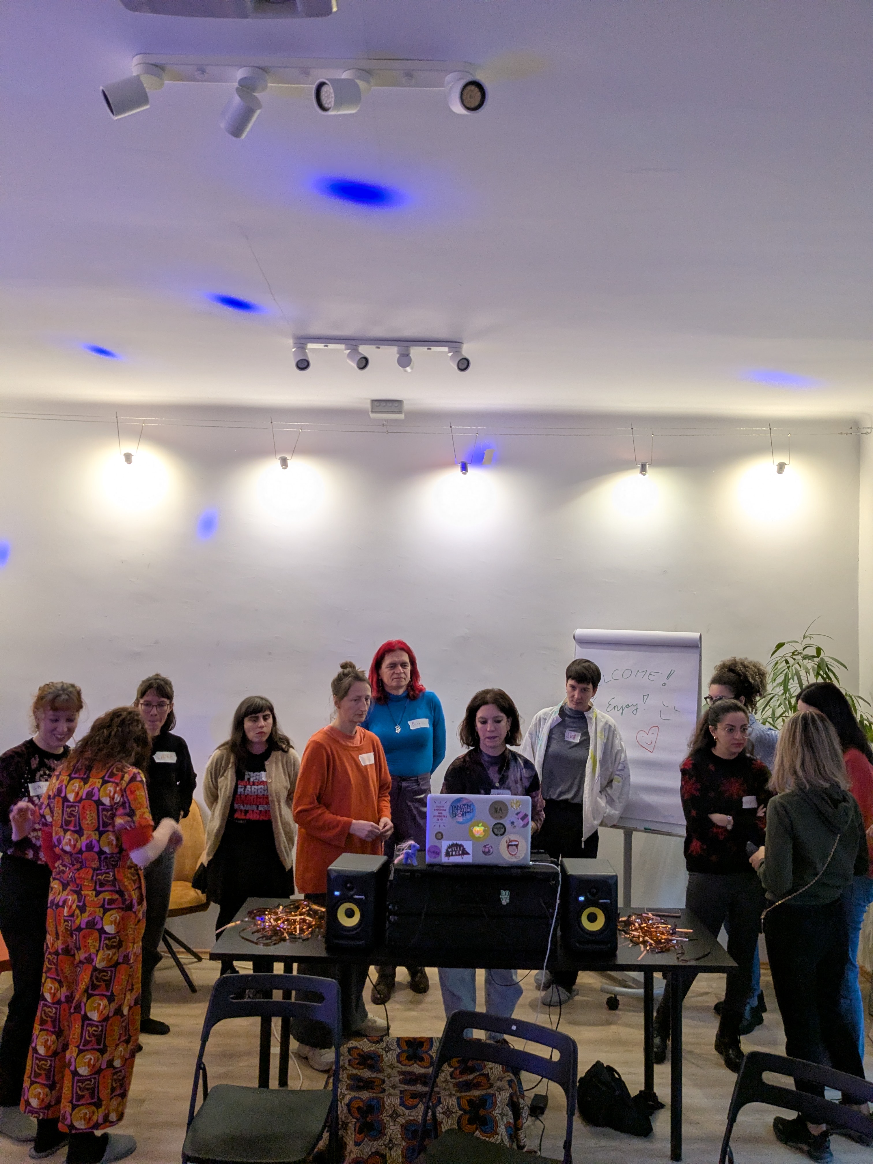 Teilnehmerinnen* der DJ*ane-Workshops mit dem Duo TATI bringen den Raum zum Klingen. Laut, unterhaltsam und voller Resonanz.