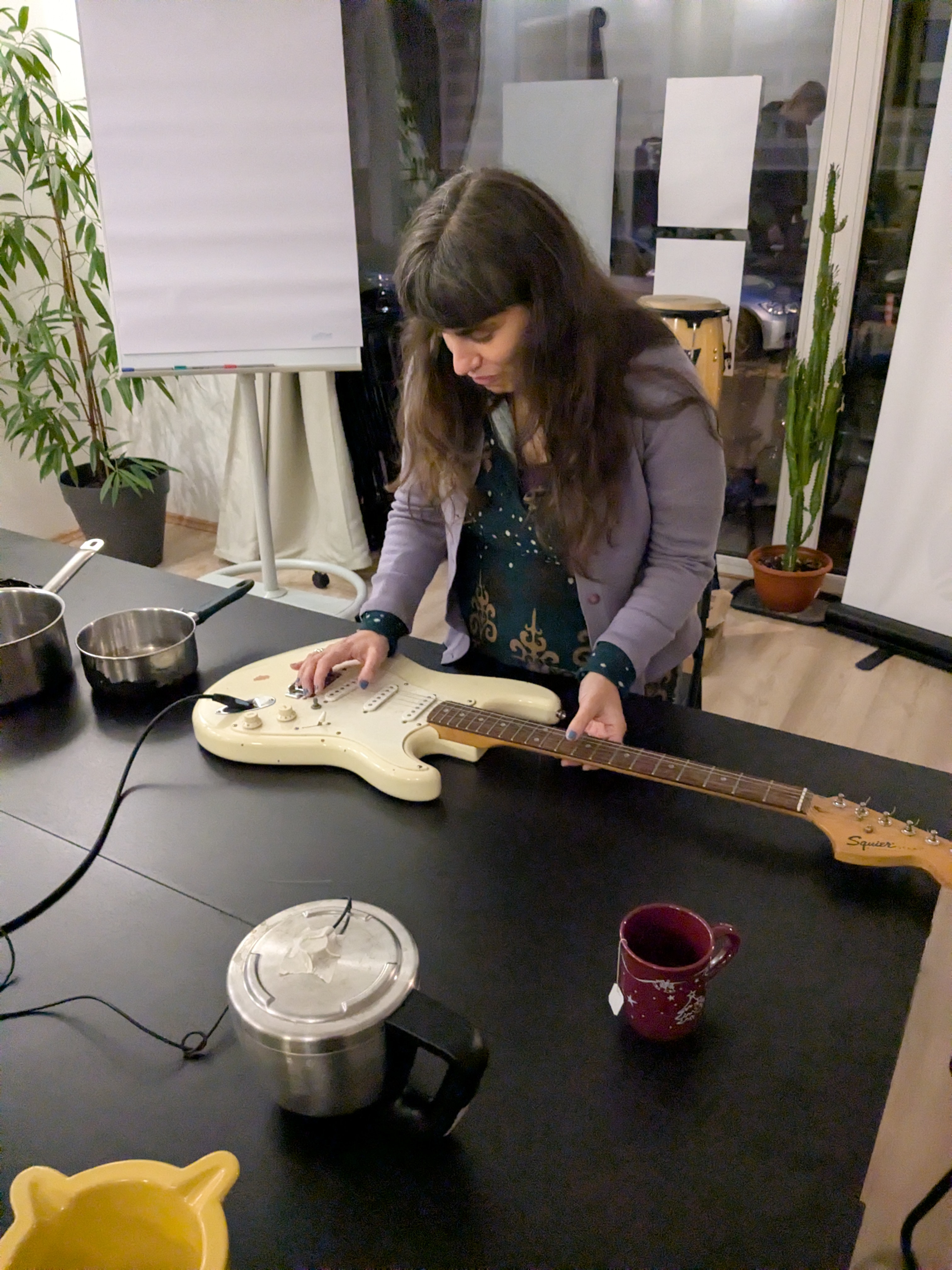 Der Kochtopf ist als Hauptelement einer partizipative Klanginstallation und wird umfunktioniert zu einem Sound-Verstär-ker. Während des Workshops haben wir gemeinsam die stereotype Konnotation des Top-fes mit weiblicher Carework gesprengt und ihn mit neuen akustischen Inhalten gefüllt.